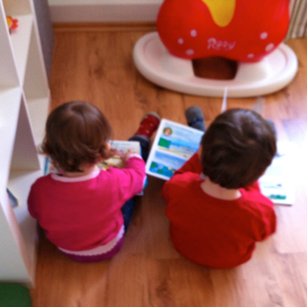 Im Alltag begleite ich alles Tun mit Sprache, durch diese ständigen Wiederholungen bekommen die Kinder Sprachanreize, die sie dann in Ihrer Zeit umsetzen. Das ist ein sehr schöner Bereich meiner Arbeit, diese Entwicklung von nonverbaler Kommunikation bis zum Austausch von Wörtern und ganzen Sätzen mitzubekommen. Singen mit rhythmischer Begleitung, Verse und Reime und Begrüßungslieder, dienen außerdem dem Erlernen der Sprache. Bilderbücher sind auch ein immer wieder beliebtes Medium der Kinder, um Wörter und Zusammenhänge zu lernen und sprachlich umzusetzen.